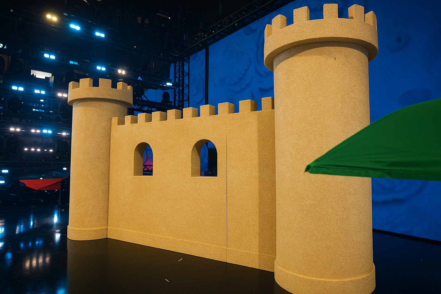 Para esta actuación, Valua creó en tiempo récord un castillo gigante que simulaba estar hecho completamente de arena, evocando la estética costera y veraniega que caracteriza al artista, gracias al encargo la agencia creativa Vampire. La escenografía de gran formato ocupó el escenario central del Roig Arena y se erigió como una pieza escultural única, mezcla de fantasía, técnica y precisión artística.